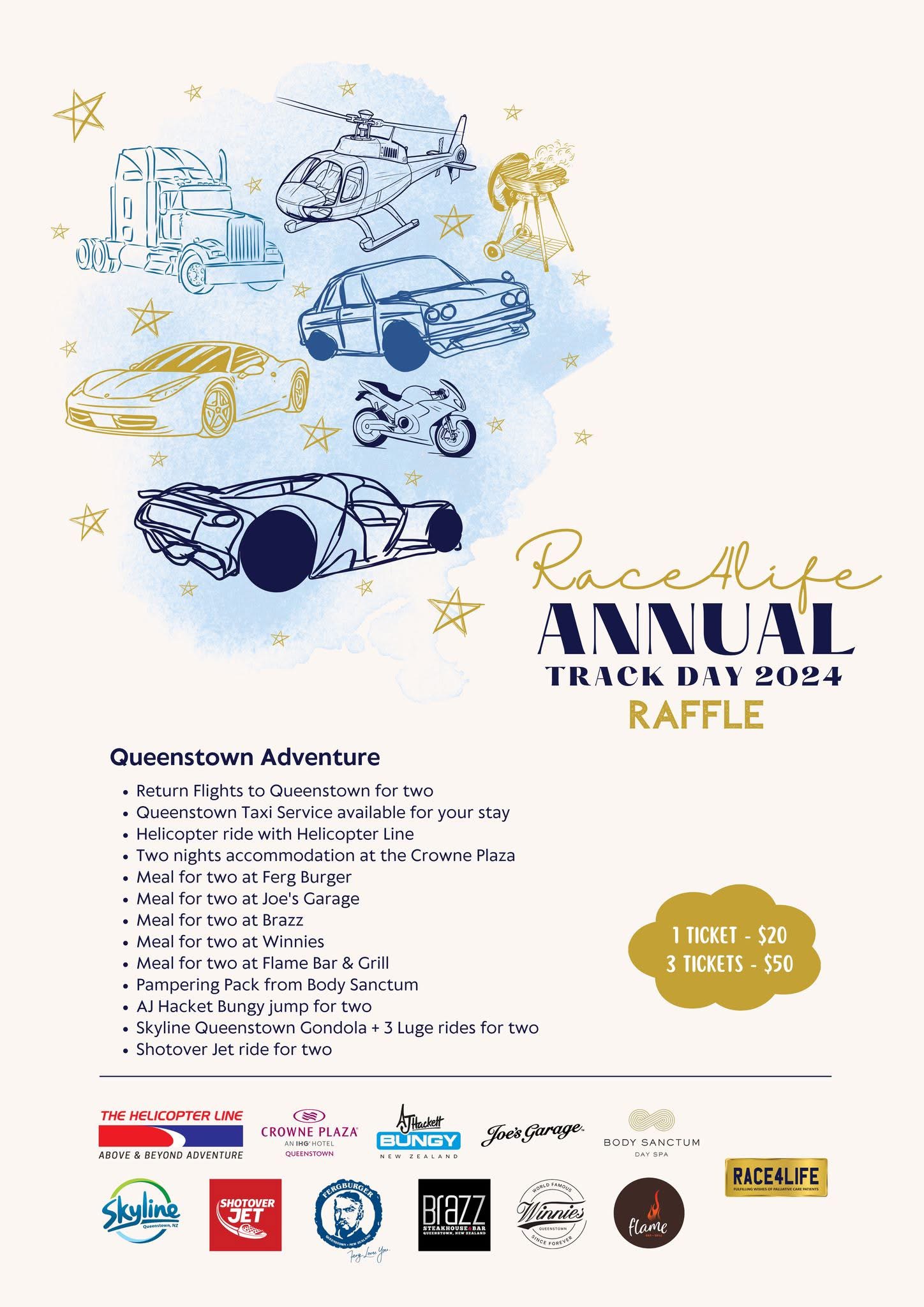 Throughout 2024 we had a raffle running at all three Race4Life Track Days. We were supported very generously by our amazing service providers in Queenstown. The winner of each raffle won a 5 star all expenses paid holiday for two in Queenstown.